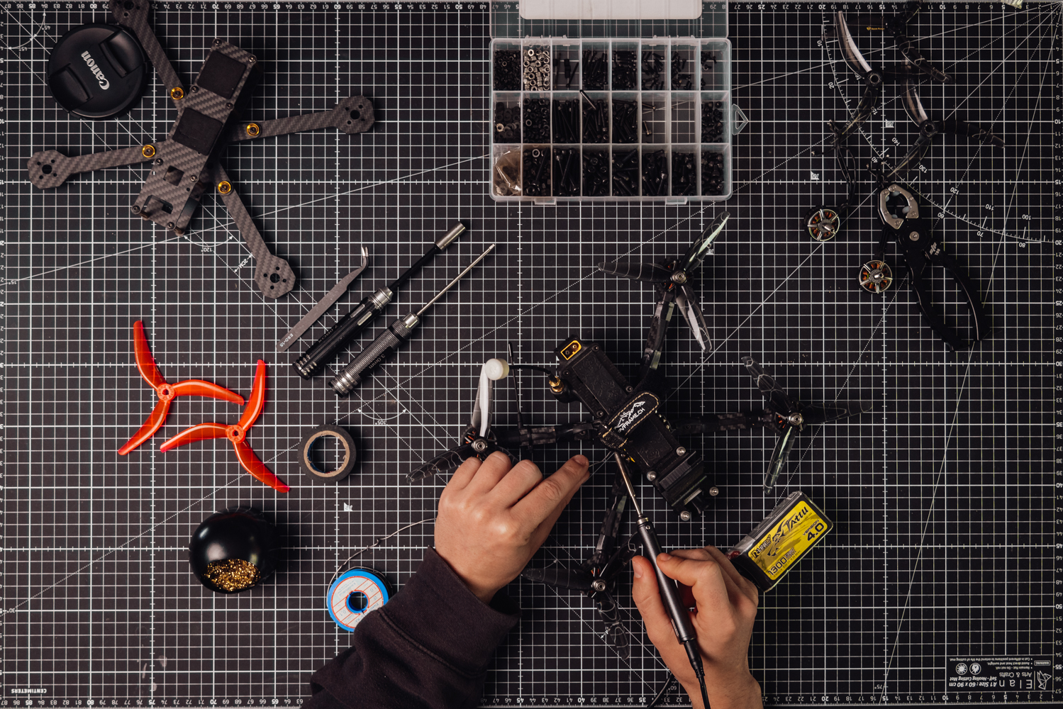 Fast jedem ist bekannt, dass FPV-Drohnen selbst gebaut und programmiert werden müssen. Zu Beginn haben wir fertige Bausätze verwendet. Die Performance dieser Drohnen war uns jedoch nicht gut genug.
